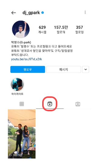 프로필에 보면, 릴스 탭이 있습니다. 릴스 작성 물이 있다면 여기에도 표시가 됩니다.