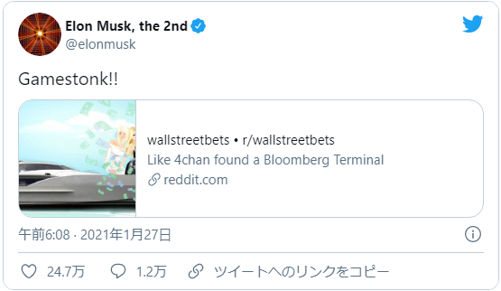 또한 1월 27일의 일론 머스크에 의한 트윗도 영향을 주었다고 생각되고 있습니다.