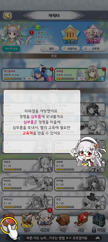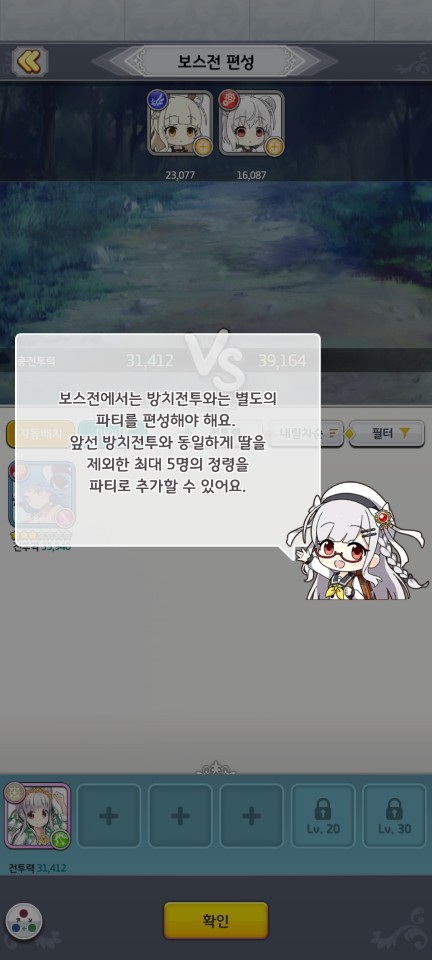 방치 전투의 파티와 보스전의 파티는 별도입니다. 새로운 정령을 획득하게 되면 양쪽에 모두