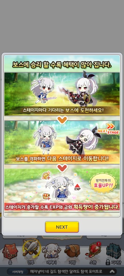 전투는 보스전을 승리해야 다음 스테이지로 이동합니다. 그냥 방치만 하면 얻을 수 있는 금화와 경험치가