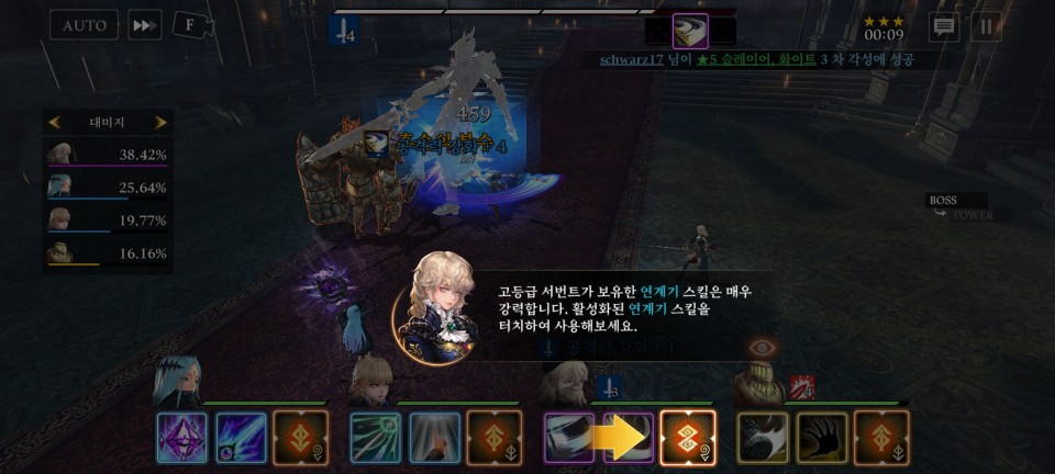 튜토리얼 전투에서 배웠듯이 스킬게이지가 채워지면 스킬 버튼을 눌러주면 됩니다.